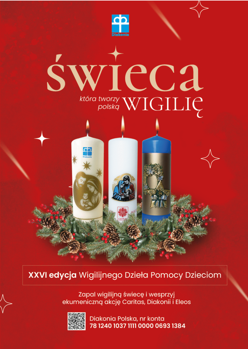 Diakonia Kościoła Ewangelicko-Augsburskiego wraz z Caritas Polska Kościoła Rzymskokatolickiego i Prawosławnym Metropolitalnym Ośrodkiem Miłosierdzia ELEOS po raz dwudziesty szósty organizują wspólną, ekumeniczną akcję charytatywną Wigilijne Dzieło Pomocy Dzieciom. W jej ramach rozprowadzane będą świece wigilijne, a dochód z ich sprzedaży przeznaczony zostanie na projekty Diakonii na rzecz potrzebujących dzieci.